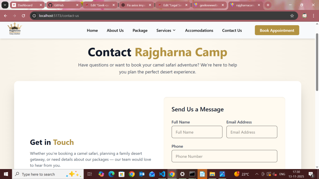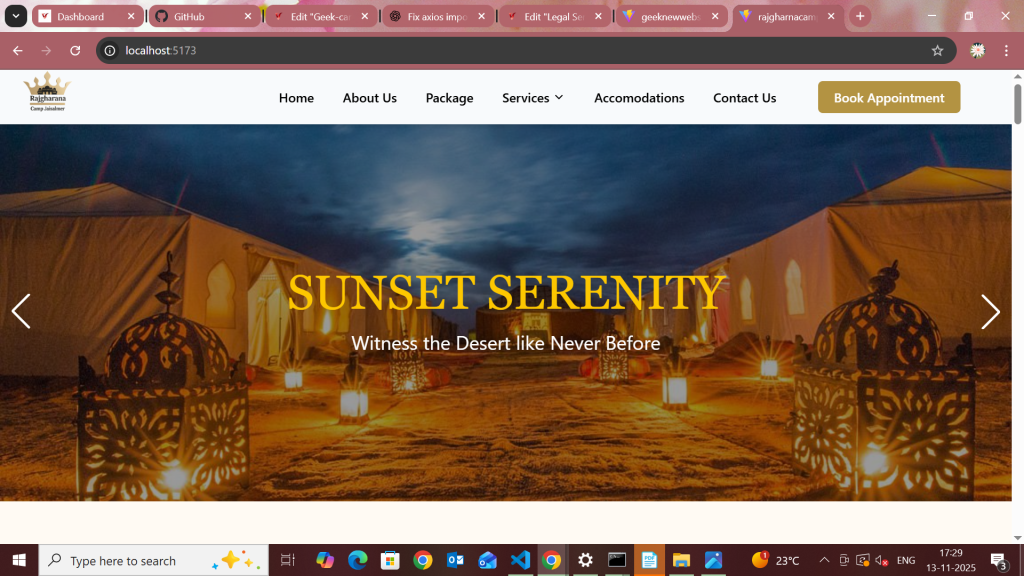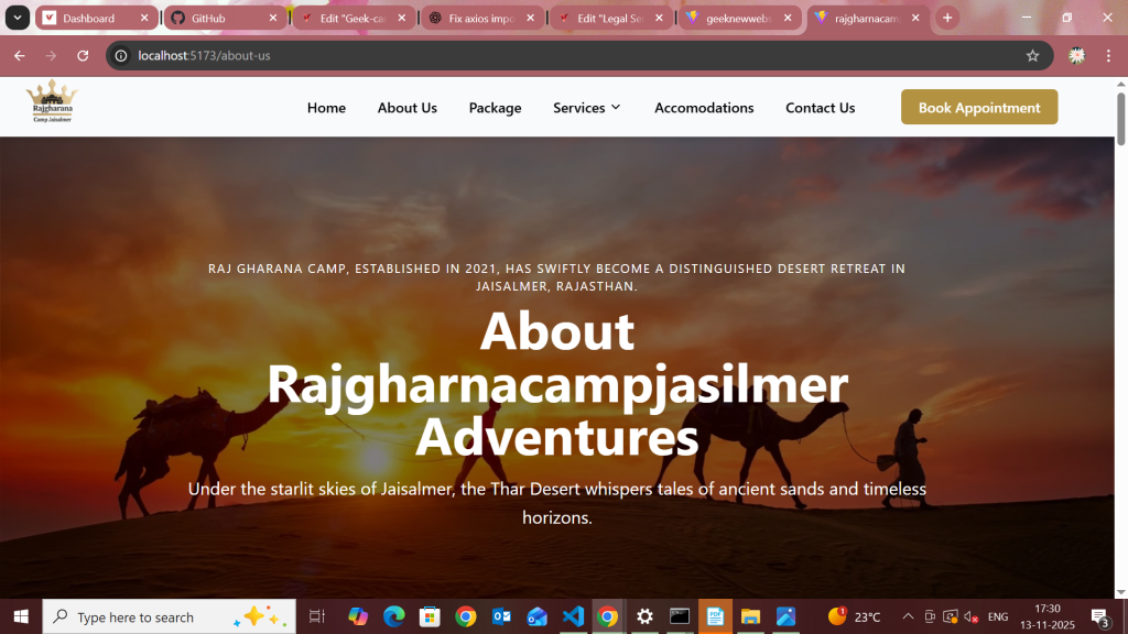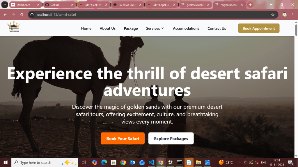 Rajgharana Camp Jaisalmer is a luxury desert camping experience that blends royal Rajasthani hospitality with modern comfort. Set amidst the golden dunes of Jaisalmer, the brand offers a unique stay featuring cultural performances, authentic cuisine, and premium tents. Our goal was to design a visually stunning and performance-driven website that captures the charm of desert living while driving online reservations.